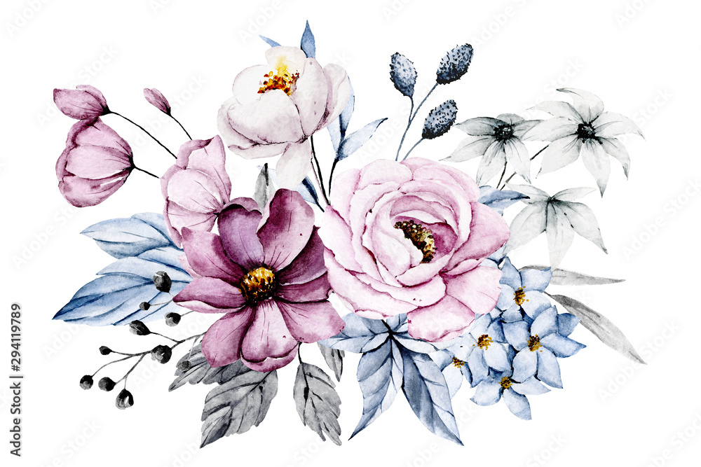 Pink And Blue Flowers Leaves Watercolor Floral Clip Art Bouquet Perfectly For Printing Design On Invitations Cards Wall Art And Other Isolated On White Background Hand Painting Stock Illustration Adobe Stock